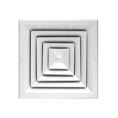 Difusores de techo de 4 vías para inyección de aire con templador regulador de caudal de aletas opuestas. Panel central fijo. Acabado en pintura blanca electrostática de alta resistencia.